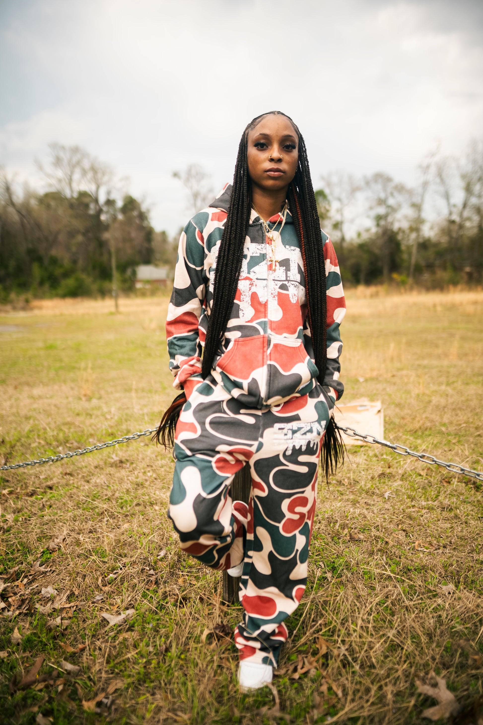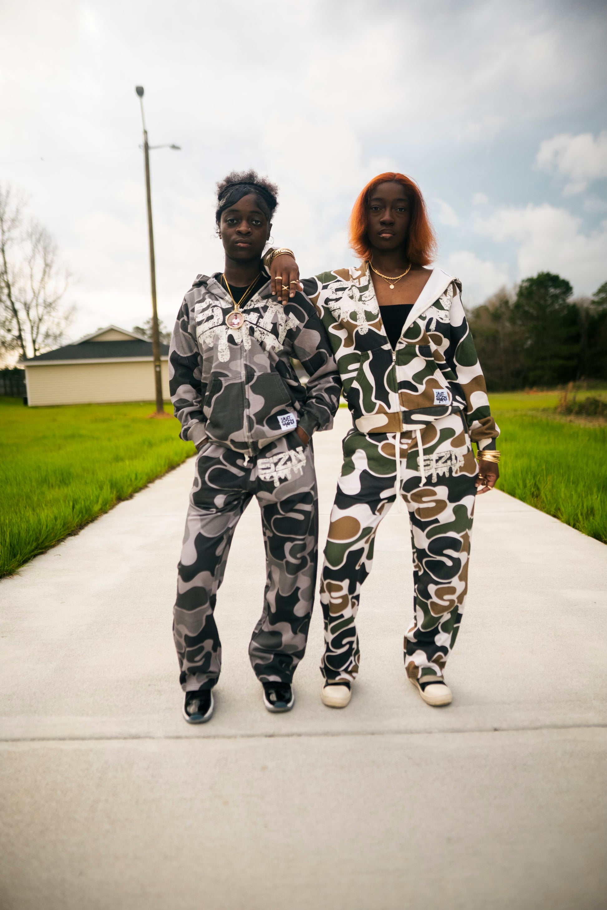 Custom Cut and sew garment manufactured in China.Custom Camo Print with SauceSzN jumbo screen print.Zipper on the bottom pants leg.Fits Oversized.